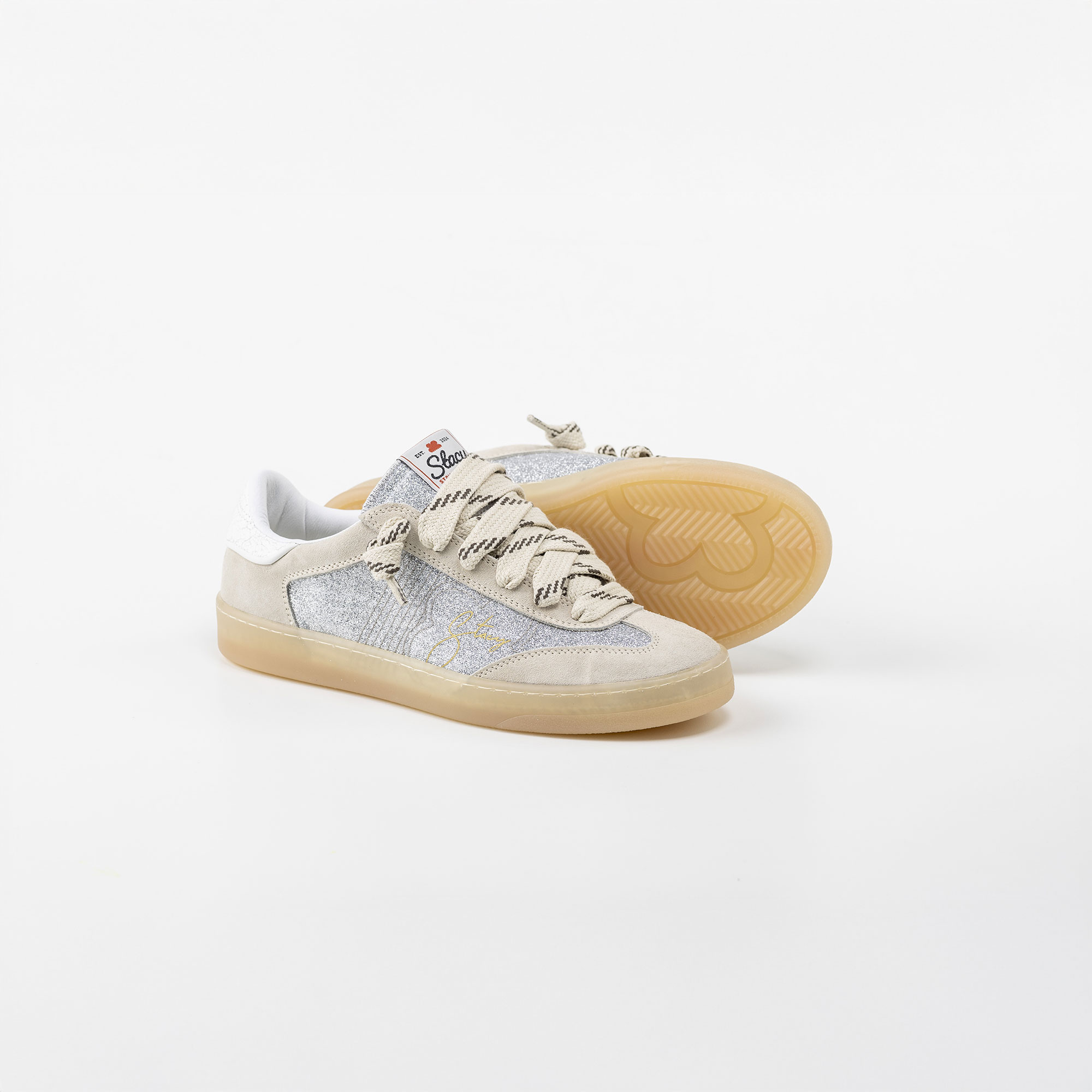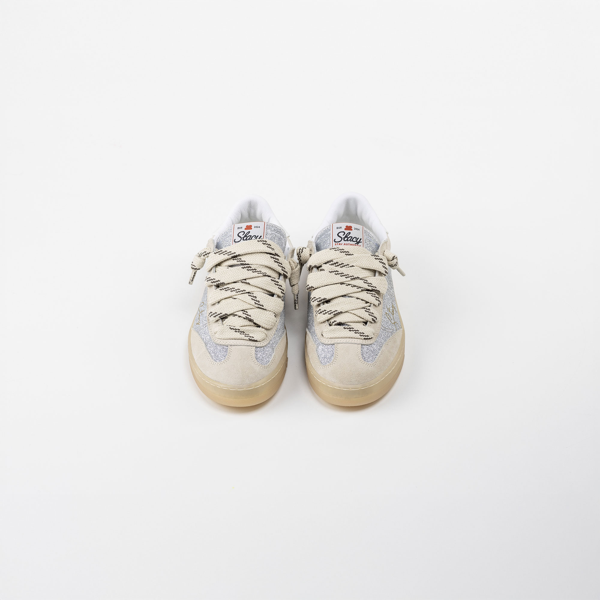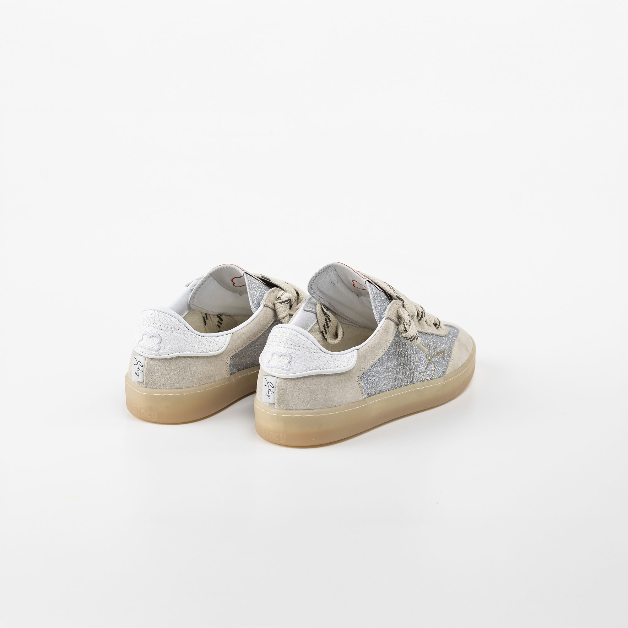 Silver glitter fabric and grey suede